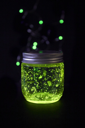Closed green light glowing jar in the dark background witch sparkling bokeh