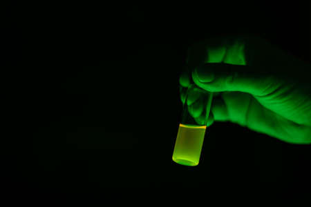Glowing green compound solution collected from column chromatography in multiple test tube in a chemistry laboratory for biomedical research