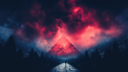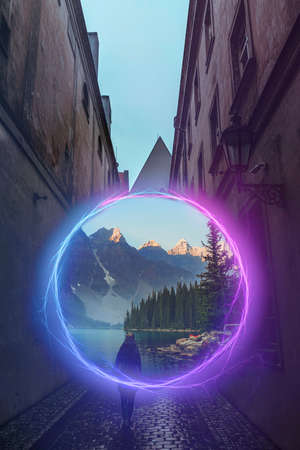 A science fiction graphic design concept of a glowing portal. With a mysterious figure mirrored in a misty spooky landscape at night.