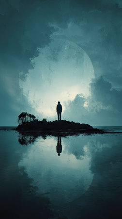 A silhouetted person stands on a small island, framed by dramatic, cloudy skies and a large, pale light source. The tranquil scene features a mirrored reflection in the still water below. The composition utilizes cool colors and soft textures. Suitable for conceptual art, design projects, and illustrative purposes.