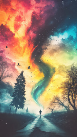 A surreal and enchanting scene featuring a silhouette of a person surrounded by floating pink petals against a colorful sky. Perfect for evoking emotions of serenity and wonder.