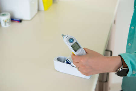 Close up of a hand wearing surgical glove taking temperature of a person with a digital thermometer