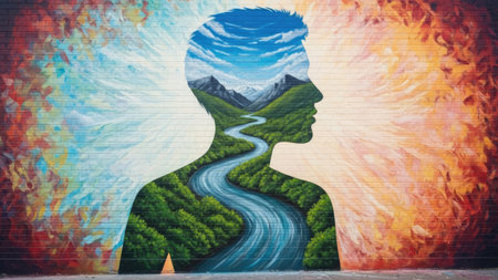 This artwork depicts a human silhouette filled with a landscape of mountains, river, and sky. The image features vibrant colors with an artistic style. It could be used for various commercial projects related to psychology, nature, or conceptual design. The composition features a symmetrical layout, possibly for editorial purposes.