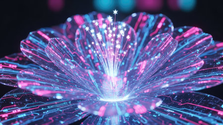 An artistic rendering features a digital flower in shades of blue, pink, and purple. The petals are highlighted with neon lines, showcasing a technological theme. The composition uses a close-up perspective, possibly suggesting a modern design. Suitable for creative projects and digital applications.