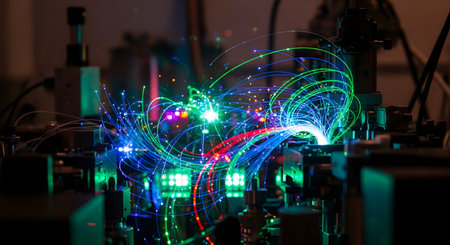 A complex scientific apparatus in a dark laboratory, with a chaotic yet beautiful explosion of colorful, glowing fiber optic light trails. This image represents cutting-edge research in quantum computing, photonics, data transfer, and advanced physics.