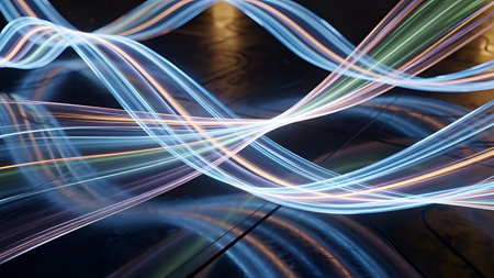 Abstract streaks of vibrant blue, green, and purple light trails create a sense of motion and energy on a...