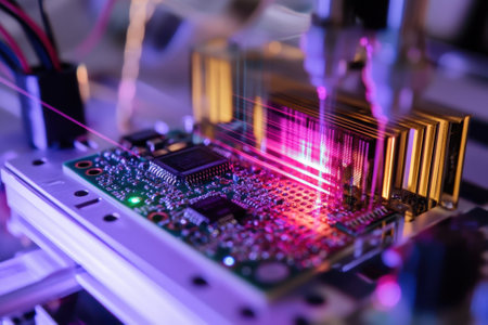 Engineers conduct precision testing on a circuit board using laser technology in a lab setting.