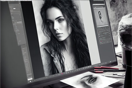 A shot of the artists workspace featuring various tools like a stylus reference images and a steaming cup of coffee as the digital tablet glows with a partially completed portrait tha