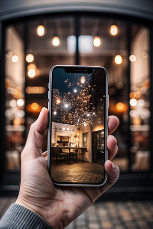 A hand holding a smartphone that displays an augmented reality with colorful, digital art elements overlaying an urban street scene.