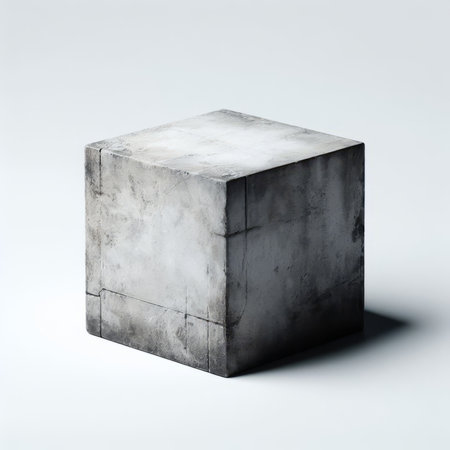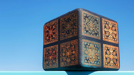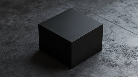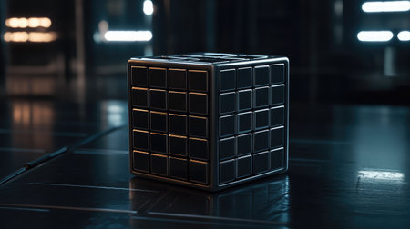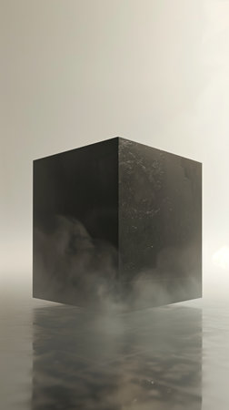 A textured black cube rests on a reflective surface in a dimly lit space, showcasing its angular features and shadows. Generative AI