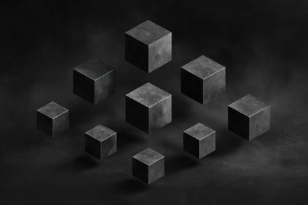 This image features several dark cubes suspended against a dark backdrop. The cubes are rendered with a textured, almost metallic appearance, creating a sense of depth and volume. The composition utilizes overhead lighting. This image is suitable for various applications, including design projects and conceptual visuals.