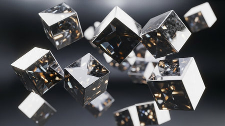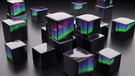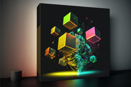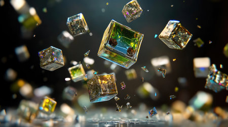 A captivating image of colorful cubes suspended mid-air, displaying vibrant reflections and mesmerizing sparkling particles, creating a magical atmosphere.