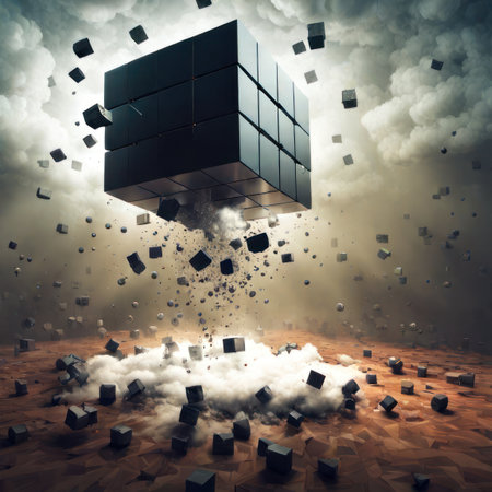 Abstract 3d rendering of a cube with flying cubes in the sky