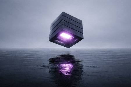 AI generated sci fi abstract scene with dark metallic floating cube glowing purple energy core above calm water creating minimal futuristic atmosphere mystery and power