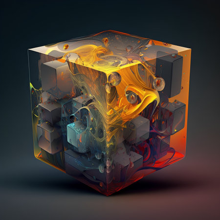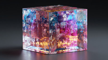 A translucent cube features vibrant, blended colors and light refractions. The geometric form stands out against a dark backdrop. Its style hints at digital art, with the potential for use in concepts related to design, technology, or abstract themes. The composition benefits from dramatic lighting.