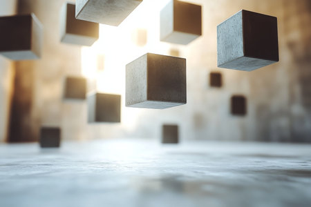 Abstract floating concrete cubes in a minimal industrial setting, illuminated by warm light, creating a modern and surreal effect.