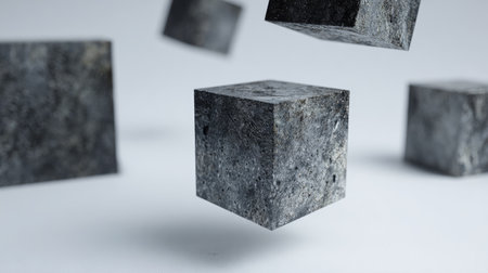 This striking image features three floating geometric cubes with a textured surface, creating an elegant contrast against a minimalistic background, perfect for modern design.