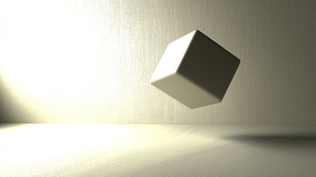 A conceptual 3D render of a cube rolling upward on an inclined plane, creating an illusion, with space for text.