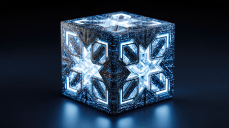 An illuminated cube presents intricate geometric patterns with glowing edges in a dark setting. The artwork features a futuristic design, with vibrant blue light emanating from within. It could be suitable for digital art, technology, or design projects. This imagery offers potential for both commercial and editorial applications.