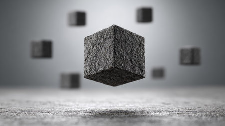 This image presents a central textured cube surrounded by blurred cubes in a gradient gray backdrop. The objects appear to float in a cool, modern environment. The composition utilizes a shallow depth of field, with soft lighting and a focus on geometric forms. This image is suitable for various commercial design projects and abstract visual content.