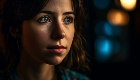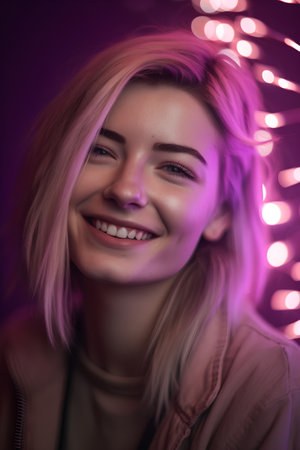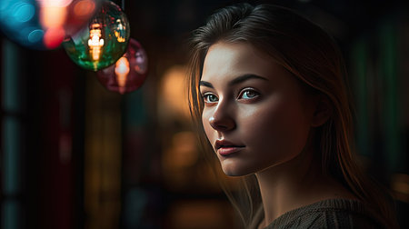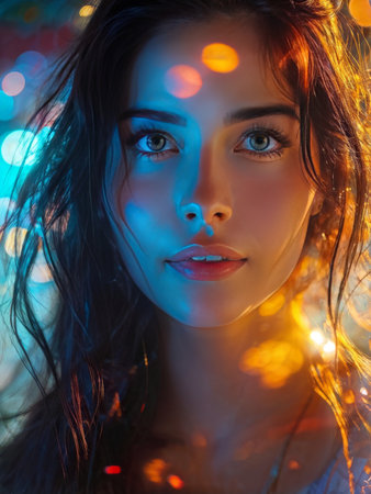 Portrait of a woman illuminated by colorful lights with bokeh effect in the background