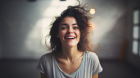 This striking portrait features a young woman exuding confidence and warmth with her radiant smile and tousled hair, set against a softly blurred background.