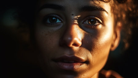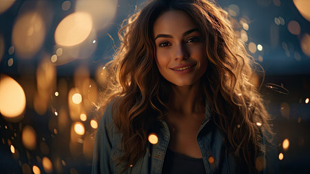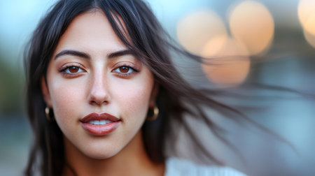 A woman stands outdoors with a soft breeze blowing through her hair, illuminated by warm light. Her confident smile and expressive eyes convey a sense of joy and tranquility.