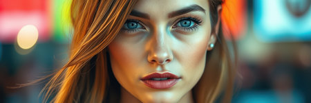 Young woman with striking blue eyes stands confidently in a colorful urban environment during twilight hours