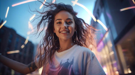 A woman stands confidently in an urban environment illuminated by city lights at night. Her warm smile and expressive eyes capture the essence of the vibrant nightlife around her.