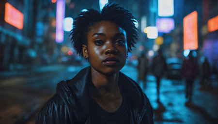 photo of beautiful adult african woman with hood coat standing posing for picture at night future city, generative AI
