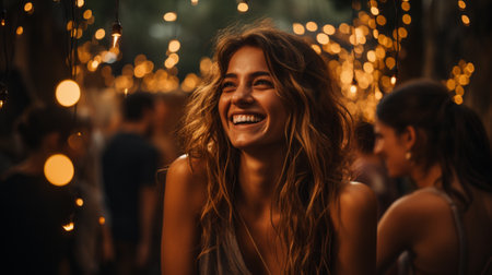A young woman smiles warmly, illuminated by soft lights at an evening gathering in an urban setting.