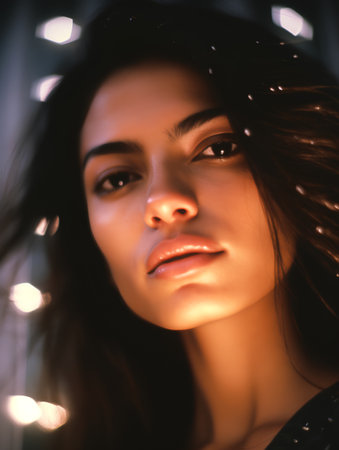 A captivating woman with long, layered brown hair gazes confidently at the camera in the dimly lit street, her fashion sense and alluring features illuminated by the contrast of light and dark