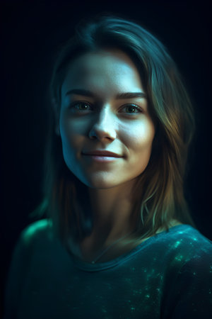 Radiant portrait of a beautiful woman with a dark blue background and a warm smile that lights up the image with joy and happiness