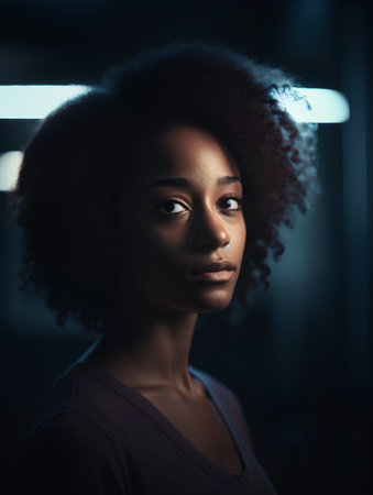 Beautiful african american woman with afro hairstyle and outlined in light. ai generative.