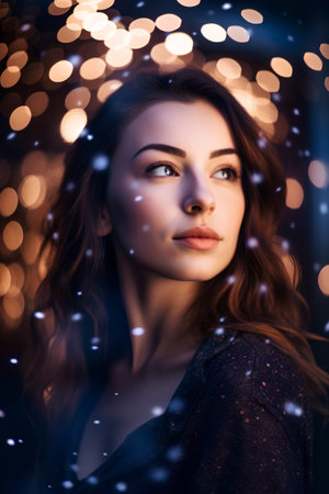 Young adult Caucasian woman looking at camera in snowy night generated by artificial intelligence