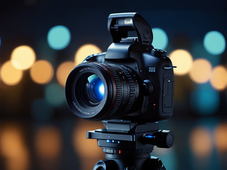 Professional digital camera on tripod on blurred bokeh background, closeup