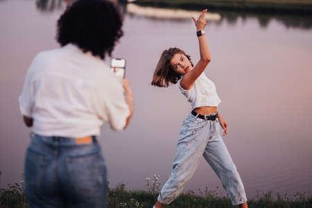 Back view of Young woman holding cell phone and making photo of her girl friend. Two girlfriends take pictures of each other on Smartphone camera on nature background. Summer holidays and technology