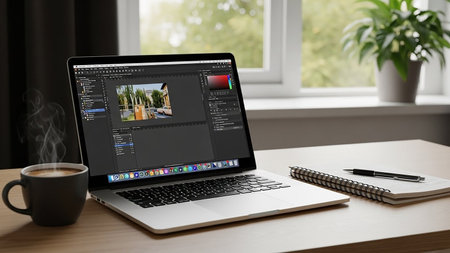 A laptop screen Adobe Photoshop software on a wooden desk with a steaming coffee mug and a notepad.