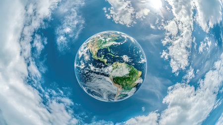 tiny planet in blue sky with beautiful clouds. Transformation of spherical panorama 360 degrees. Spherical abstract aerial view. Curvature of space.