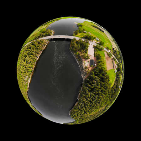 A three dimensional aerial panoramic view of rapid Susikoski at river Kymijoki, Finland, in a mini planet panorama style.