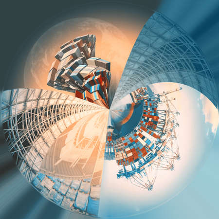 Logistics and transportation of international container cargo ship at port at sunset time, Freight, shipping, nautical vessel concept. Creative collage