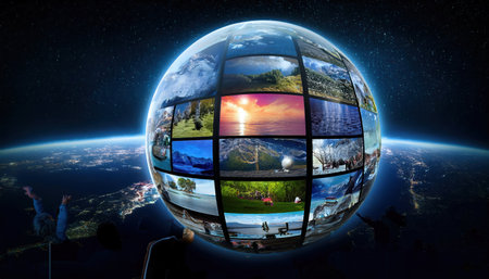 An orb hovers in the cosmos displaying a collage of stunning landscapes while surrounded by countless stars, showing Earth's beauty from space.
