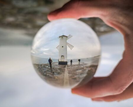 White Windmill at end of coast full of puddles near Baltic sea in Swinoujscie in reflection of crystal ball