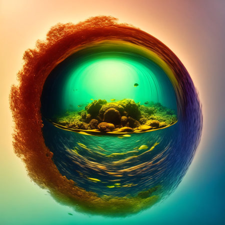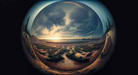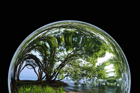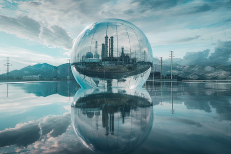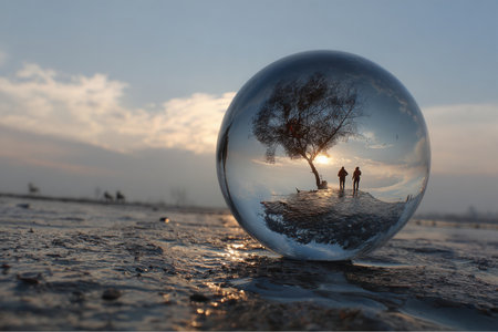 A large glass sphere is floating in a body of water, reflecting the surrounding landscape. Concept of tranquility and serenity, as the calm water and the glass sphere create a peaceful atmosphere