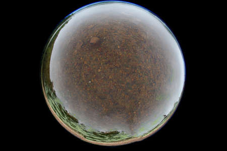 Landscape photographed through a glass sphere. Forest around the road.