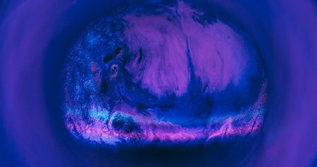 Round neon splatter. Flowing texture. Defocused purple blue pink color ink in chemical water rainbow light stripes floating on abstract background.