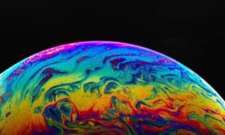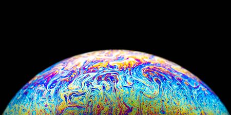 Macro picture of half soap bubble on black ground look like abstract psychedelic color planet in space