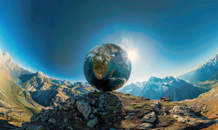 An Earth globe set against a mountain backdrop with a clear blue sky