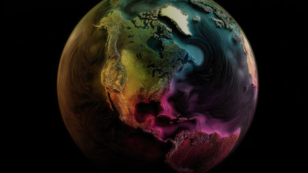 An artistic depiction presents the Earth as a vibrant globe, showcasing the North American continent. The image is characterized by a colorful palette, blending shades across the landmass and oceans. The overall style is illustrative with a dark backdrop, suitable for various design projects and editorial uses.