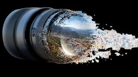 Camera lens transforming cityscape into pixels on transparent background